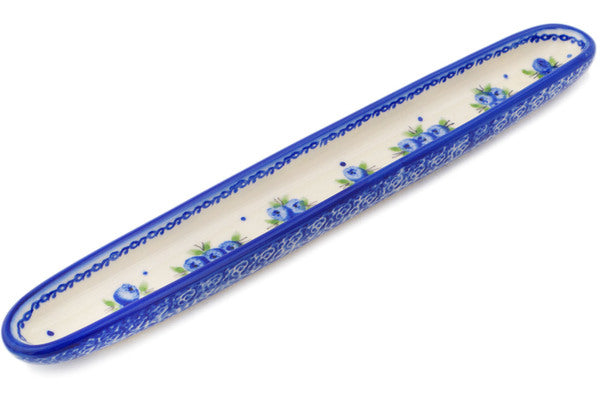This Polish Pottery Olive Dish is handmade and handpainted by the Ceramika Bona factory in Boleslawiec, Poland. Manufacturer item number H0809P. It is 1" high and measures 13" by 1¾". The weight of this Olive Dish is 0.6 lbs. It is part of the Blueberry Dreams Collection.