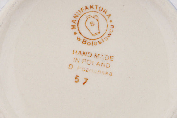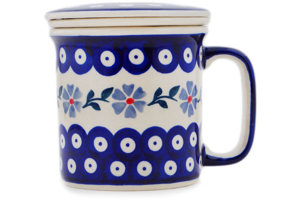 This Polish Pottery Brewing Mug is handmade and handpainted by the Manufaktura factory in Boleslawiec, Poland. Manufacturer item number H7074O. It is 4¼" high and measures 5¼" by 4¼". The capacity of this Brewing Mug is 13.53 oz (brimful) and it weighs 1.6 lbs. It is part of the Peacock Forget-Me-Not Collection.