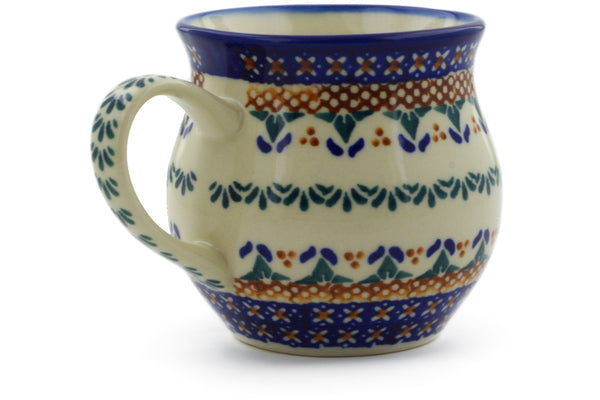 This Polish Pottery Bubble Mug is handmade and handpainted by the Ceramika Bona factory in Boleslawiec, Poland. Manufacturer item number H6140K. It is 3½" high and measures 4¾" by 3¾". The capacity of this Bubble Mug is 11.77 oz (brimful) and it weighs 0.6 lbs. It is part of the Blue Cress Collection.