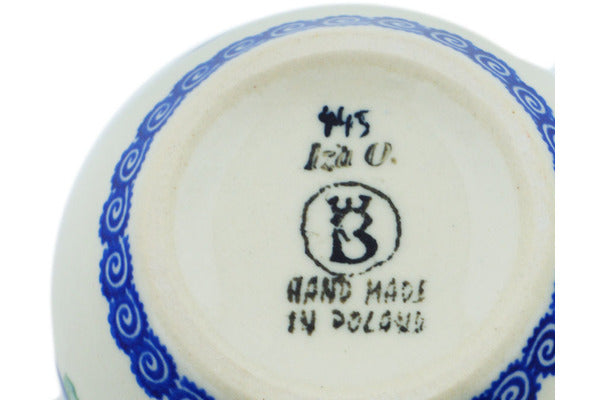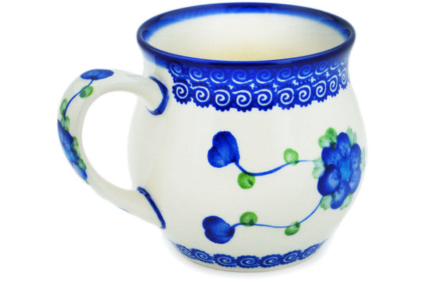 This Polish Pottery Bubble Mug is handmade and handpainted by the Ceramika Bona factory in Boleslawiec, Poland. Manufacturer item number H0309N. It is 3½" high and measures 4¾" by 3¾". The capacity of this Bubble Mug is 11.77 oz (brimful) and it weighs 0.6 lbs. It is part of the Blue Poppies Collection.