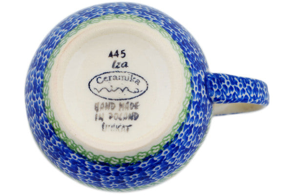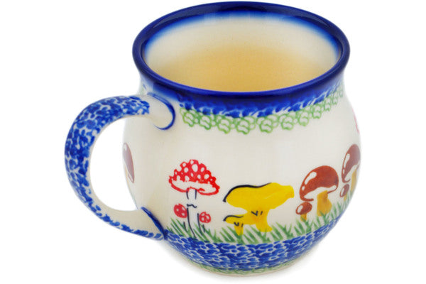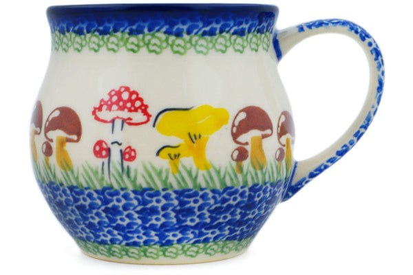 This Polish Pottery Bubble Mug is handmade and handpainted by the Ceramika Nina factory in Boleslawiec, Poland. Manufacturer item number H1556P. It is 3½" high and measures 4¾" by 3¾". The capacity of this Bubble Mug is 11.77 oz (brimful) and it weighs 0.6 lbs. It is part of the Wild Mushroom Picking Collection.