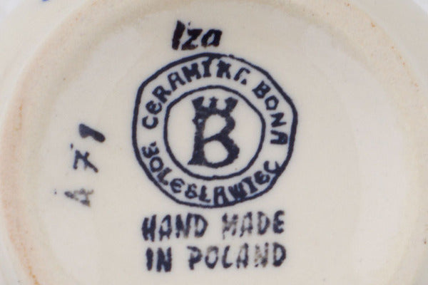 This Polish Pottery Mug is handmade and handpainted by the Ceramika Bona factory in Boleslawiec, Poland. Manufacturer item number H8825Q. It is 3¾" high and measures 4½" by 3¼". The capacity of this Mug is 13.53 oz (brimful) and it weighs 0.7 lbs. It is part of the California Poppies Collection.