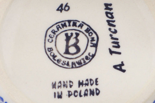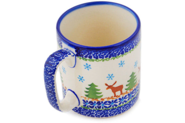 This Polish Pottery Mug is handmade and handpainted by the Ceramika Bona factory in Boleslawiec, Poland. Manufacturer item number H1854R. It is 3¾" high and measures 4¾" by 3½". The capacity of this Mug is 13.12 oz (brimful) and it weighs 0.9 lbs. It is part of the Evergreen Moose Collection.