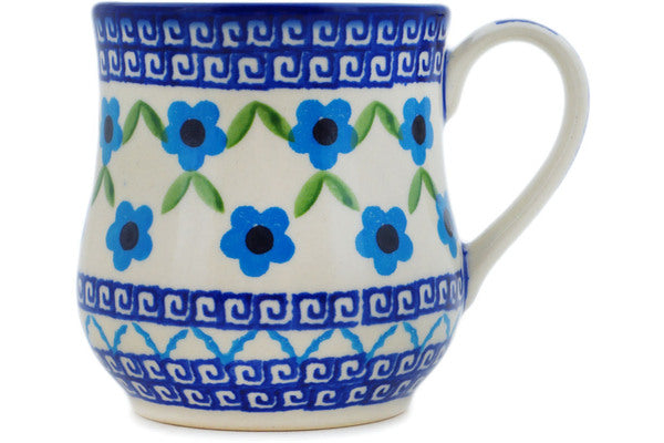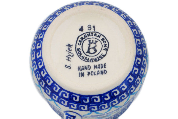 This Polish Pottery Mug is handmade and handpainted by the Ceramika Bona factory in Boleslawiec, Poland. Manufacturer item number H5698P. It is 3¾" high and measures 4½" by 3¼". The capacity of this Mug is 13.53 oz (brimful) and it weighs 0.7 lbs. It is part of the Greek Daisies Collection.