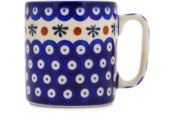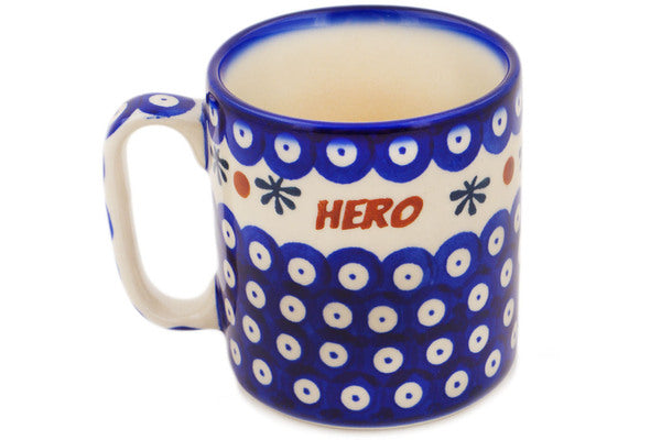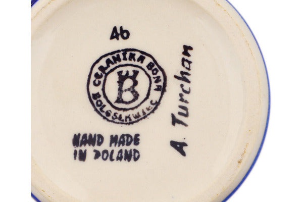 This Polish Pottery Mug is handmade and handpainted by the Ceramika Bona factory in Boleslawiec, Poland. Manufacturer item number H1642R. It is 3¾" high and measures 4¾" by 3½". The capacity of this Mug is 13.12 oz (brimful) and it weighs 0.9 lbs. It is part of the Hero Blue Eyes Collection.