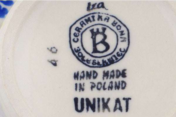 This Polish Pottery Mug is handmade and handpainted by the Ceramika Bona factory in Boleslawiec, Poland. Manufacturer item number H9820Q. It is 3¾" high and measures 4¾" by 3½". The capacity of this Mug is 13.12 oz (brimful) and it weighs 0.9 lbs. It is part of the Metamorphosis Collection.
