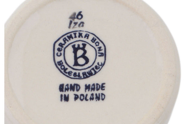 This Polish Pottery Mug is handmade and handpainted by the Ceramika Bona factory in Boleslawiec, Poland. Manufacturer item number H9854Q. It is 3¾" high and measures 4¾" by 3½". The capacity of this Mug is 13.12 oz (brimful) and it weighs 0.9 lbs. It is part of the Migrating Collection.