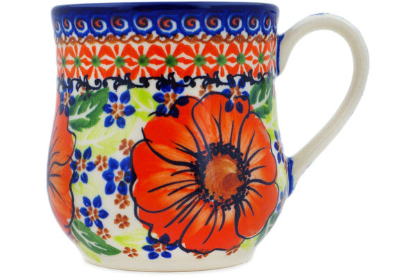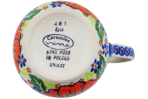 This Polish Pottery Mug is handmade and handpainted by the Ceramika Nina factory in Boleslawiec, Poland. Manufacturer item number H3241P. It is 3¾" high and measures 4½" by 3¼". The capacity of this Mug is 13.53 oz (brimful) and it weighs 0.7 lbs. It is part of the Orange Zinnia Collection.