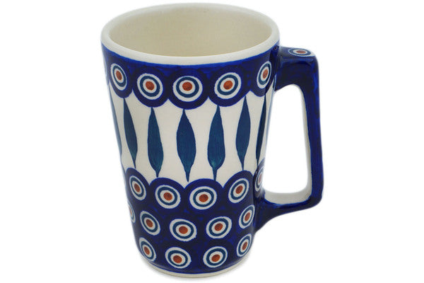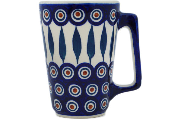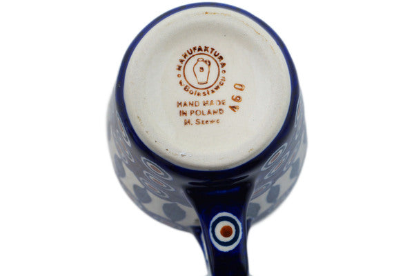 This Polish Pottery Mug is handmade and handpainted by the Manufaktura factory in Boleslawiec, Poland. Manufacturer item number H2274P. It is 5" high and measures 4" by 3½". The capacity of this Mug is 12.71 oz (brimful) and it weighs 0.9 lbs. It is part of the Peacock Collection.