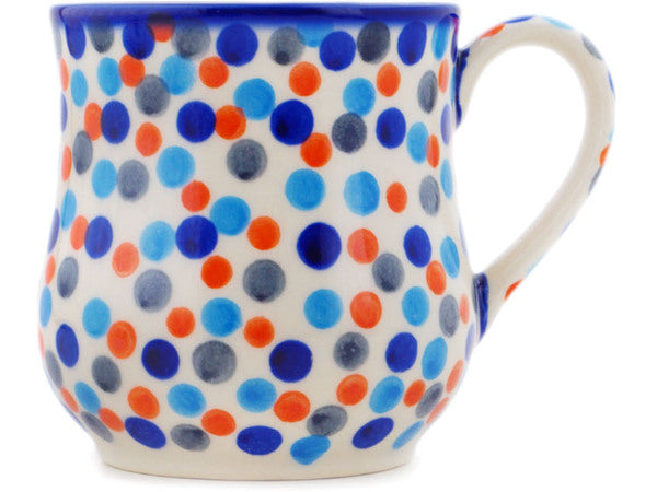 This Polish Pottery Mug is handmade and handpainted by the Ceramika Bona factory in Boleslawiec, Poland. Manufacturer item number H2008R. It is 3¾" high and measures 4½" by 3¼". The capacity of this Mug is 13.53 oz (brimful) and it weighs 0.7 lbs. It is part of the Polka Dot Frenzy Collection.