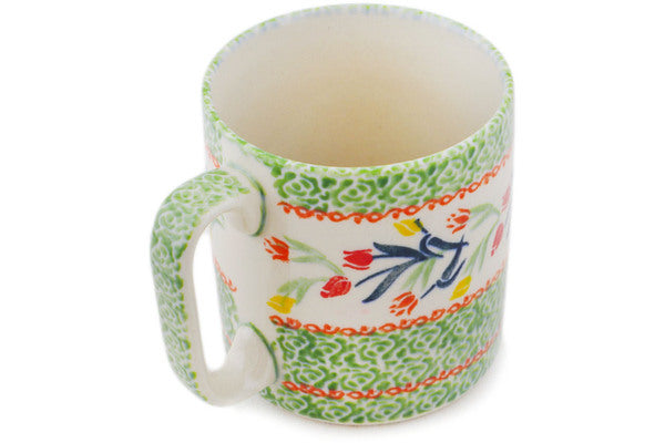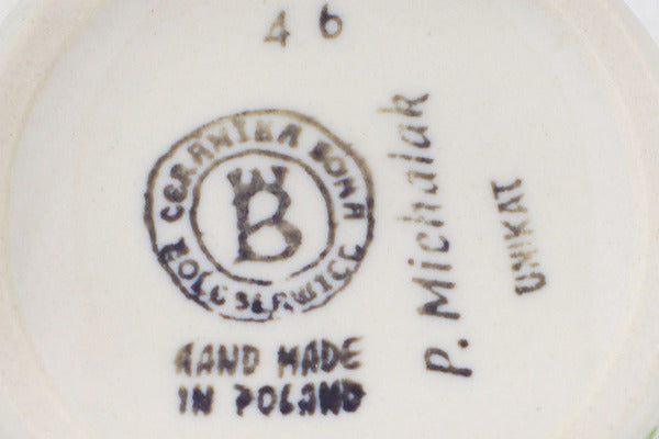 This Polish Pottery Mug is handmade and handpainted by the Ceramika Bona factory in Boleslawiec, Poland. Manufacturer item number H3535P. It is 3¾" high and measures 4¾" by 3½". The capacity of this Mug is 13.12 oz (brimful) and it weighs 0.9 lbs. It is part of the Tulip Ring Collection.