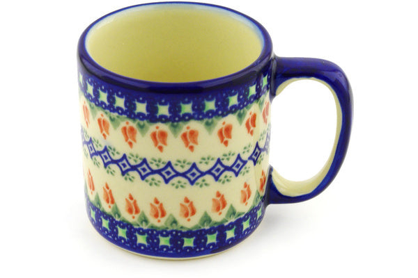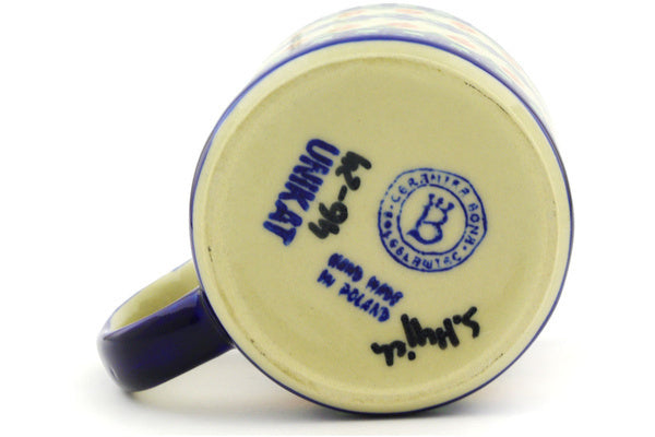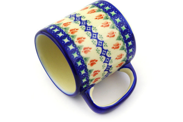 This Polish Pottery Mug is handmade and handpainted by the Ceramika Bona factory in Boleslawiec, Poland. Manufacturer item number H1668G. It is 3¾" high and measures 4¾" by 3½". The capacity of this Mug is 13.12 oz (brimful) and it weighs 0.9 lbs. It is part of the Tulips And Diamonds Collection.