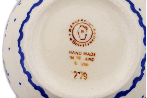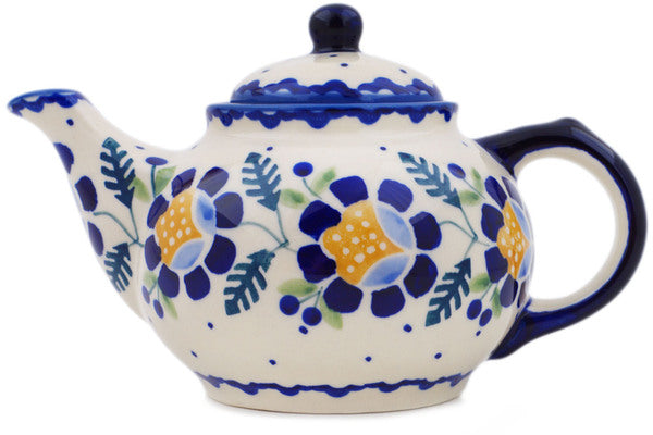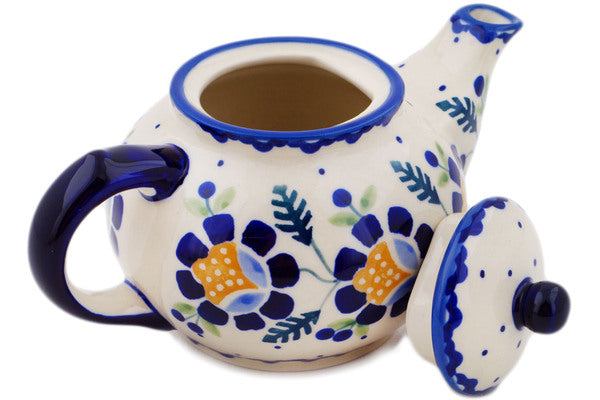 This Polish Pottery Tea or Coffee Pot is handmade and handpainted by the Manufaktura factory in Boleslawiec, Poland. Manufacturer item number H7131P. It is 4¼" high and measures 6½" by 4¼". The capacity of this Tea or Coffee Pot is 13.22 oz (brimful) and it weighs 0.7 lbs. It is part of the Orange And Blue Flower Collection.