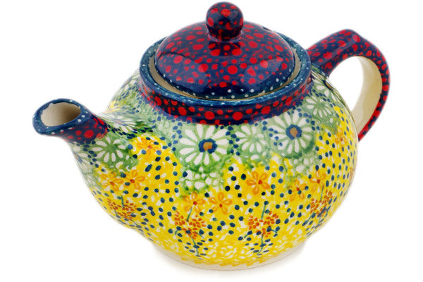 This Polish Pottery Tea or Coffee Pot is handmade and handpainted by the Manufaktura factory in Boleslawiec, Poland. Manufacturer item number H7524P. It is 4¼" high and measures 6½" by 4¼". The capacity of this Tea or Coffee Pot is 13.22 oz (brimful) and it weighs 0.7 lbs. It is part of the Sunshine Grotto Collection.