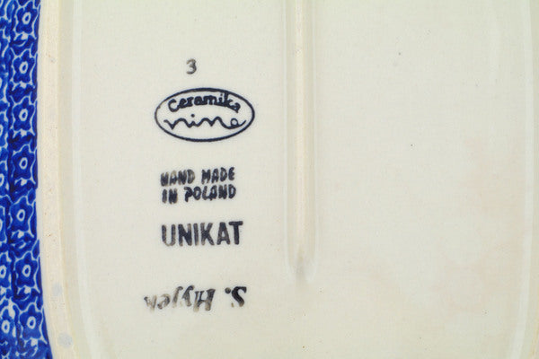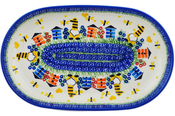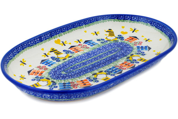 This Polish Pottery Platter is handmade and handpainted by the Ceramika Nina factory in Boleslawiec, Poland. Manufacturer item number H2616P. It is 1½" high and measures 12¾" by 8". The weight of this Platter is 2.0 lbs. It is part of the Beekeeper Gnome Collection.