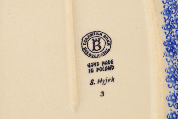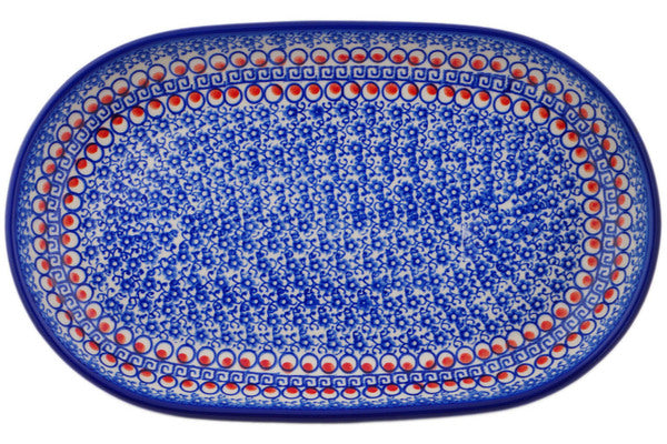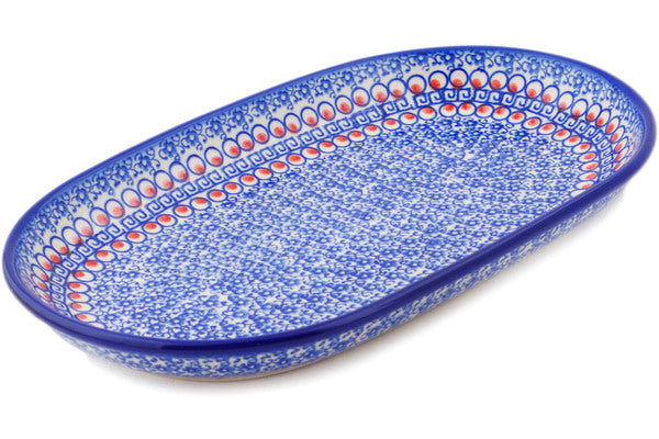 This Polish Pottery Platter is handmade and handpainted by the Ceramika Bona factory in Boleslawiec, Poland. Manufacturer item number H6878P. It is 1½" high and measures 12¾" by 8". The weight of this Platter is 2.0 lbs. It is part of the Floral Peacock Collection.