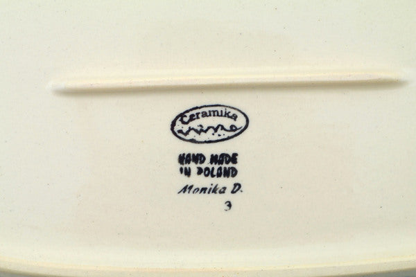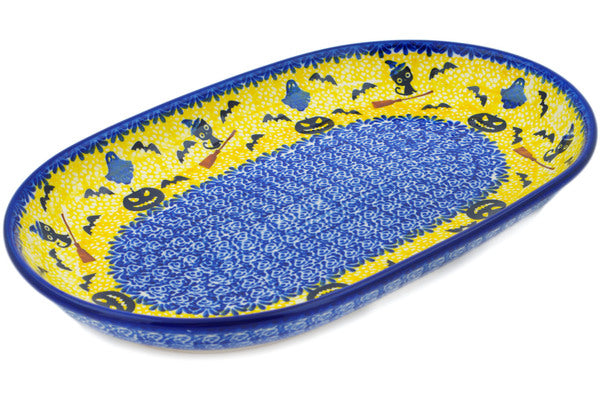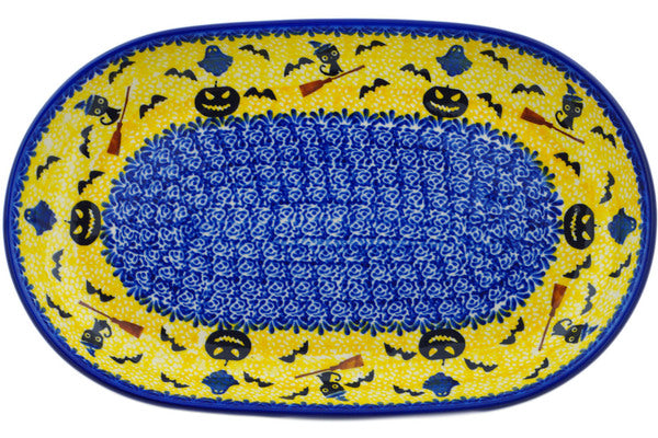 This Polish Pottery Platter is handmade and handpainted by the Ceramika Nina factory in Boleslawiec, Poland. Manufacturer item number H3281P. It is 1½" high and measures 12¾" by 8". The weight of this Platter is 2.0 lbs. It is part of the Halloween Evening Collection.