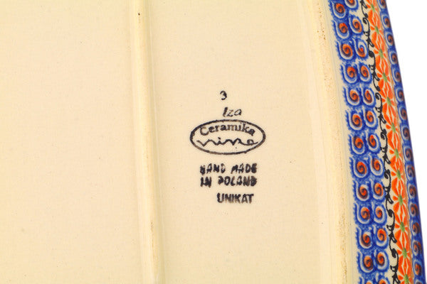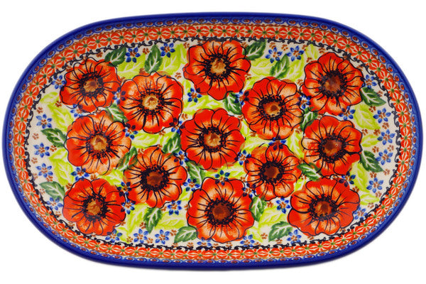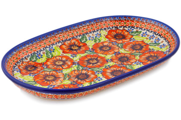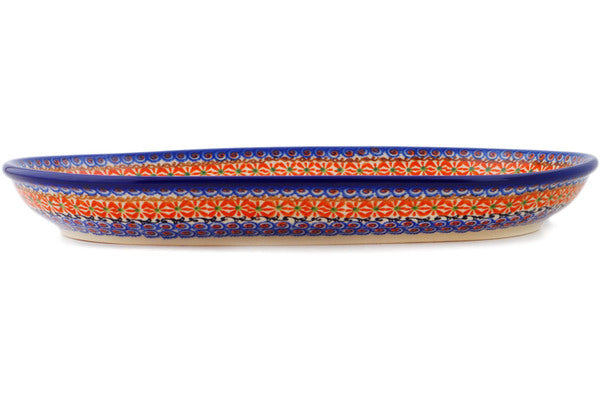 This Polish Pottery Platter is handmade and handpainted by the Ceramika Nina factory in Boleslawiec, Poland. Manufacturer item number H3211P. It is 1½" high and measures 12¾" by 8". The weight of this Platter is 2.0 lbs. It is part of the Orange Zinnia Collection.