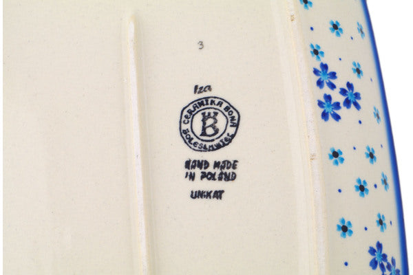 This Polish Pottery Platter is handmade and handpainted by the Ceramika Bona factory in Boleslawiec, Poland. Manufacturer item number H5464P. It is 1½" high and measures 12¾" by 8". The weight of this Platter is 2.0 lbs. It is part of the Pansy Dawn Collection.