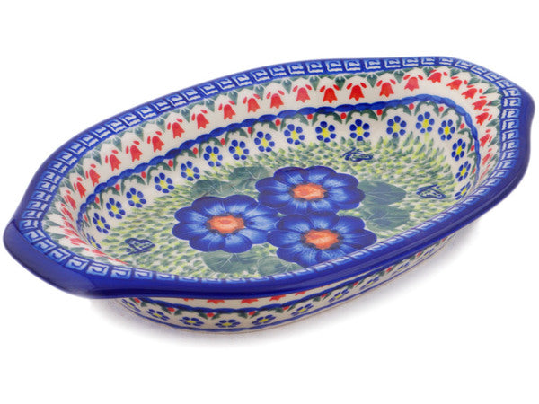 This Polish Pottery Platter with Handles is handmade and handpainted by the Ceramika Bona factory in Boleslawiec, Poland. Manufacturer item number H3651Q. It is 2" high and measures 12½" by 8". The weight of this Platter with Handles is 2.2 lbs. It is part of the Brilliant Butterfly Popp Collection.