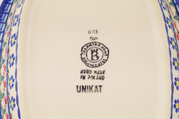 This is a Polish pottery Unikat (Signature) Platter with Handles, which means that it has been hand painted with both sponges and brushes and it is signed by the artist who painted it. Unikat pieces are the most intricate works of art. Larger Unikat items take hours of very careful work to finish.
