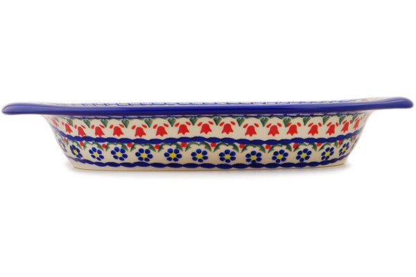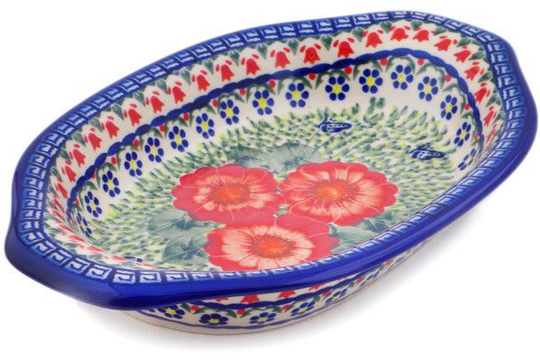 This Polish Pottery Platter with Handles is handmade and handpainted by the Ceramika Bona factory in Boleslawiec, Poland. Manufacturer item number H3134Q. It is 2" high and measures 12½" by 8". The weight of this Platter with Handles is 2.2 lbs. It is part of the Happiness Collection.