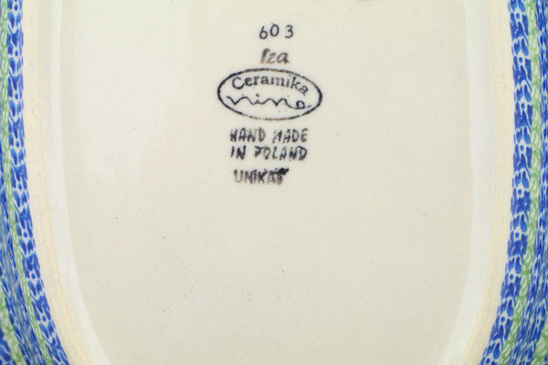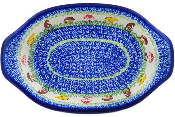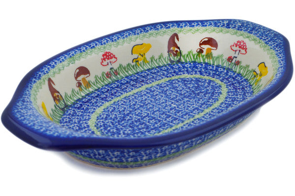 This Polish Pottery Platter with Handles is handmade and handpainted by the Ceramika Nina factory in Boleslawiec, Poland. Manufacturer item number H1541P. It is 2" high and measures 12½" by 8". The weight of this Platter with Handles is 2.2 lbs. It is part of the Mushroom Garden Collection.