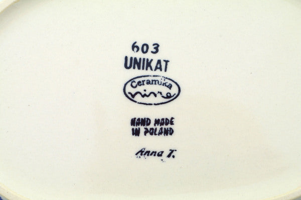 This is a Polish pottery Unikat (Signature) Platter with Handles, which means that it has been hand painted with both sponges and brushes and it is signed by the artist who painted it. Unikat pieces are the most intricate works of art. Larger Unikat items take hours of very careful work to finish.