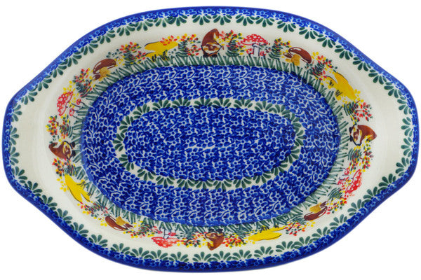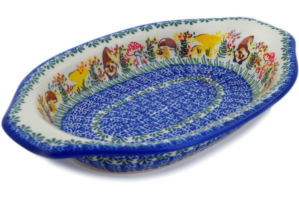 This Polish Pottery Platter with Handles is handmade and handpainted by the Ceramika Nina factory in Boleslawiec, Poland. Manufacturer item number H1542P. It is 2" high and measures 12½" by 8". The weight of this Platter with Handles is 2.2 lbs. It is part of the Mushroom Love Collection.
