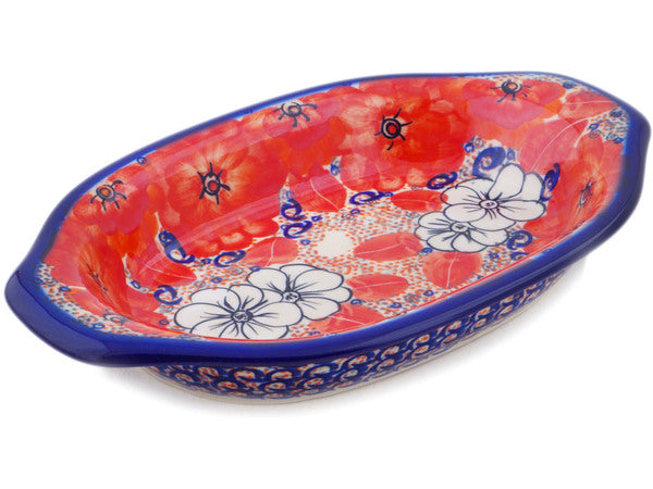 This Polish Pottery Platter with Handles is handmade and handpainted by the Ceramika Bona factory in Boleslawiec, Poland. Manufacturer item number H8492Q. It is 2" high and measures 12½" by 8". The weight of this Platter with Handles is 2.2 lbs. It is part of the Poppy Passion Collection.