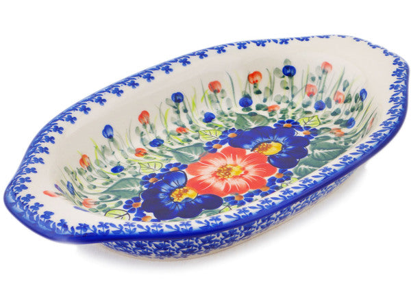 This Polish Pottery Platter with Handles is handmade and handpainted by the Ceramika Bona factory in Boleslawiec, Poland. Manufacturer item number H7145Q. It is 2" high and measures 12½" by 8". The weight of this Platter with Handles is 2.2 lbs. It is part of the Poppy Trio Collection.
