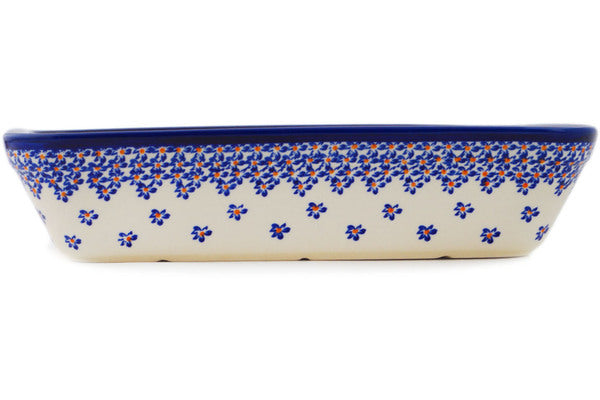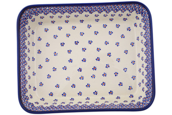 This Polish Pottery Rectangular Baker is handmade and handpainted by the Zaklady Ceramiczne factory in Boleslawiec, Poland. Manufacturer item number H6763N. It is 2½" high and measures 13¼" by 11". The capacity of this Rectangular Baker is 134.58 oz (brimful) and it weighs 4.2 lbs. It is part of the Remember Me Collection.