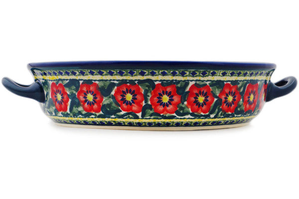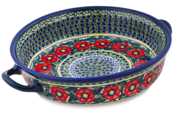 This Polish Pottery Round Baker with Handles is handmade and handpainted by the Zaklady Ceramiczne factory in Boleslawiec, Poland. Manufacturer item number H7923N. It is 2½" high and measures 12¾" by 10½". The capacity of this Round Baker with Handles is 80.31 oz (brimful) and it weighs 2.7 lbs. It is part of the Poppies All Around Collection.