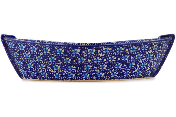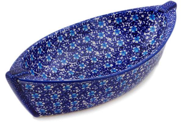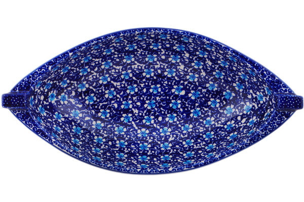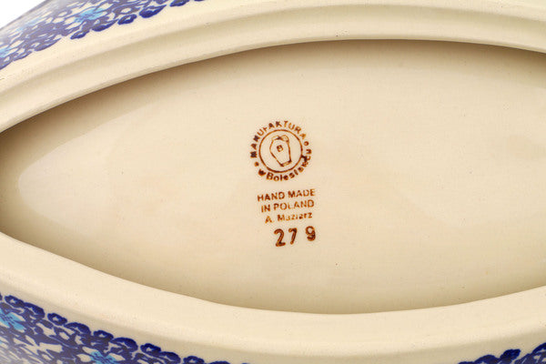 This Polish Pottery Bowl is handmade and handpainted by the Manufaktura factory in Boleslawiec, Poland. Manufacturer item number H7313P. It is 3¾" high and measures 14½" by 7¼". The capacity of this Bowl is 50.82 oz (brimful) and it weighs 2.9 lbs. It is part of the Flowers On The Lake Collection.