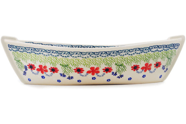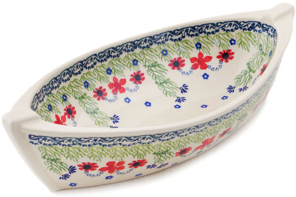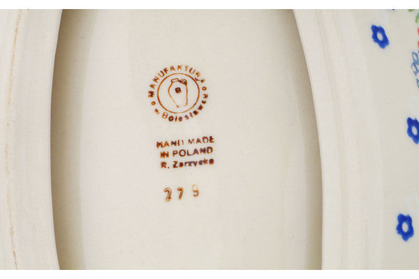 This Polish Pottery Bowl is handmade and handpainted by the Manufaktura factory in Boleslawiec, Poland. Manufacturer item number H7484P. It is 3¾" high and measures 14½" by 7¼". The capacity of this Bowl is 50.82 oz (brimful) and it weighs 2.9 lbs. It is part of the Red Blossom Collection.