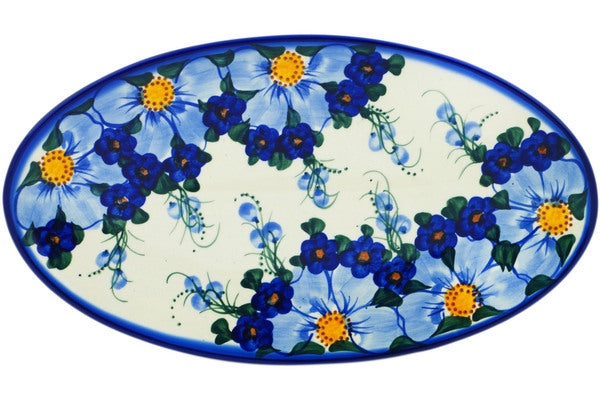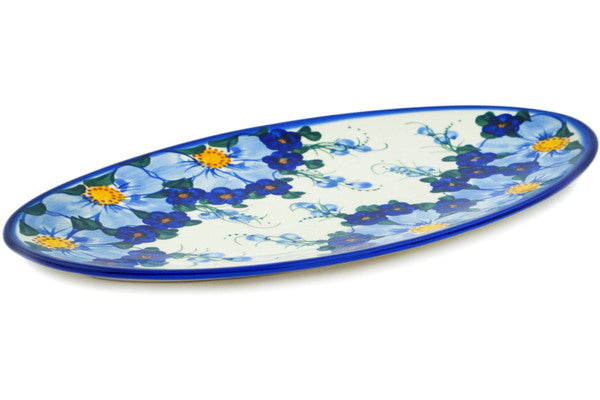 This Polish Pottery Oval Plate is handmade and handpainted by the Two People factory in Boleslawiec, Poland. Manufacturer item number H3321N. It is ½" high and measures 14" by 8". The weight of this Oval Plate is 1.6 lbs. It is part of the Himalayan Blue Poppy Collection.