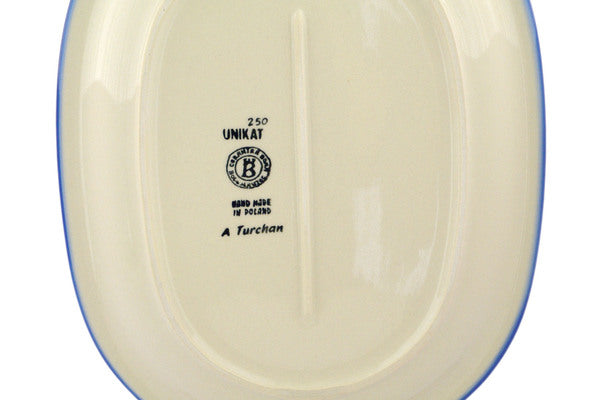 This is a Polish pottery Unikat (Signature) Oval Platter, which means that it has been hand painted with both sponges and brushes and it is signed by the artist who painted it. Unikat pieces are the most intricate works of art. Larger Unikat items take hours of very careful work to finish.