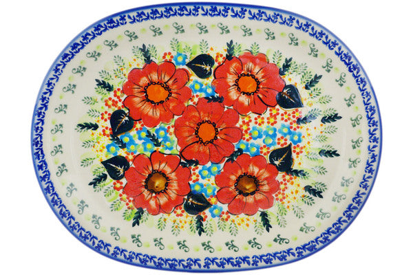 This Polish Pottery Oval Platter is handmade and handpainted by the Ceramika Bona factory in Boleslawiec, Poland. Manufacturer item number H6686R. It is 1½" high and measures 14¼" by 11". The capacity of this Oval Platter is 33.64 oz (brimful) and it weighs 3.9 lbs. It is part of the Bold Red Poppies Collection.