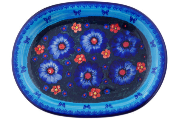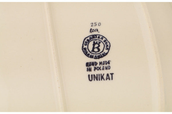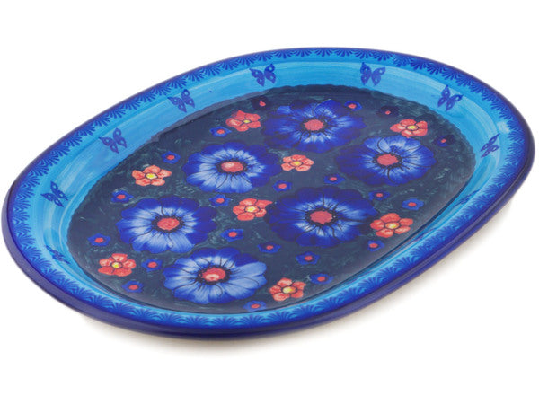 This Polish Pottery Oval Platter is handmade and handpainted by the Ceramika Bona factory in Boleslawiec, Poland. Manufacturer item number H0174Q. It is 1½" high and measures 14¼" by 11". The capacity of this Oval Platter is 33.64 oz (brimful) and it weighs 3.9 lbs. It is part of the Midnight Garden Collection.