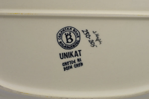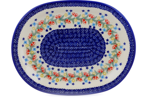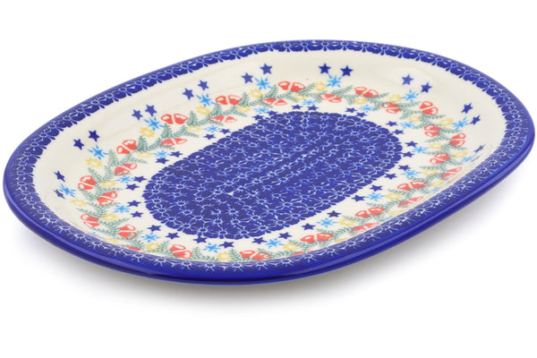 This Polish Pottery Oval Platter is handmade and handpainted by the Ceramika Bona factory in Boleslawiec, Poland. Manufacturer item number H2212J. It is 1½" high and measures 14¼" by 11". The capacity of this Oval Platter is 33.64 oz (brimful) and it weighs 3.9 lbs. It is part of the Wreath Of Bells Collection.