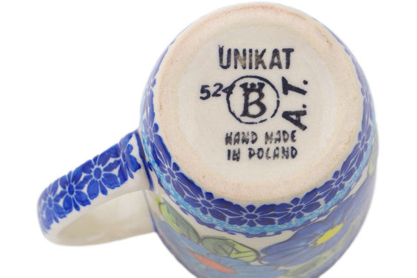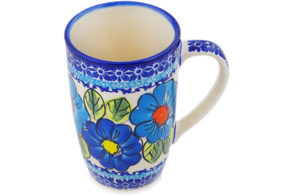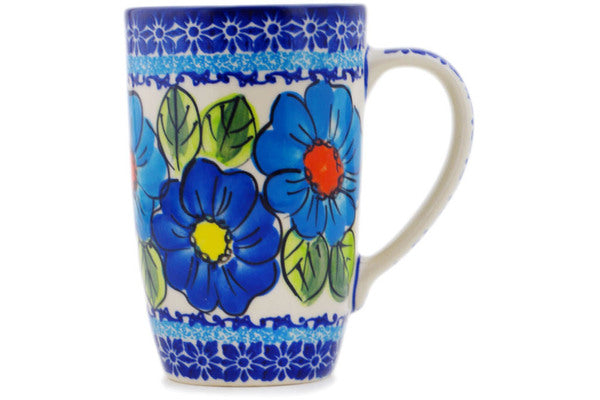 This Polish Pottery Mug is handmade and handpainted by the Ceramika Bona factory in Boleslawiec, Poland. Manufacturer item number H8810Q. It is 5¼" high and measures 4¾" by 3¼". The capacity of this Mug is 14.20 oz (brimful) and it weighs 1.0 lbs. It is part of the Bold Blue Poppies Collection.