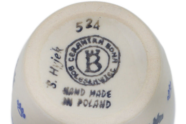 This Polish Pottery Mug is handmade and handpainted by the Ceramika Bona factory in Boleslawiec, Poland. Manufacturer item number H9398P. It is 5¼" high and measures 4¾" by 3¼". The capacity of this Mug is 14.20 oz (brimful) and it weighs 1.0 lbs. It is part of the Boo Boo Kitty Paws Collection.