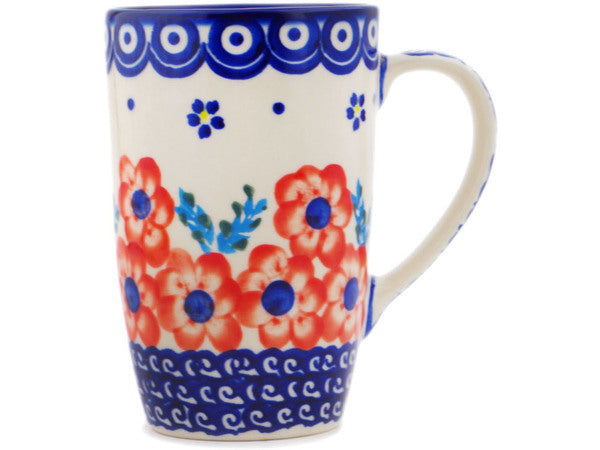 This Polish Pottery Mug is handmade and handpainted by the Ceramika Bona factory in Boleslawiec, Poland. Manufacturer item number H7102Q. It is 5¼" high and measures 4¾" by 3¼". The capacity of this Mug is 14.20 oz (brimful) and it weighs 1.0 lbs. It is part of the Flower Star Collection.