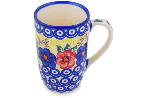 This Polish Pottery Mug is handmade and handpainted by the Ceramika Bona factory in Boleslawiec, Poland. Manufacturer item number H7121Q. It is 5¼" high and measures 4¾" by 3¼". The capacity of this Mug is 14.20 oz (brimful) and it weighs 1.0 lbs. It is part of the Neon Poppies Collection.