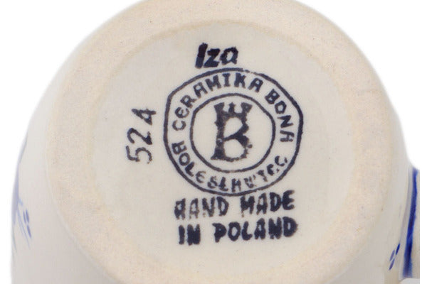 This Polish Pottery Mug is handmade and handpainted by the Ceramika Bona factory in Boleslawiec, Poland. Manufacturer item number H9569Q. It is 5¼" high and measures 4¾" by 3¼". The capacity of this Mug is 14.20 oz (brimful) and it weighs 1.0 lbs. It is part of the Poppy Triad Collection.