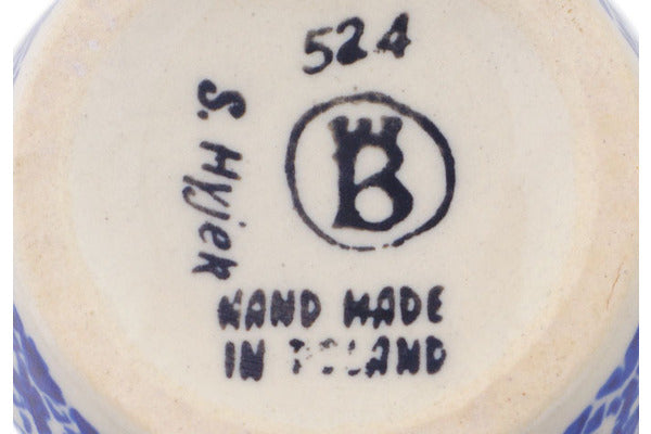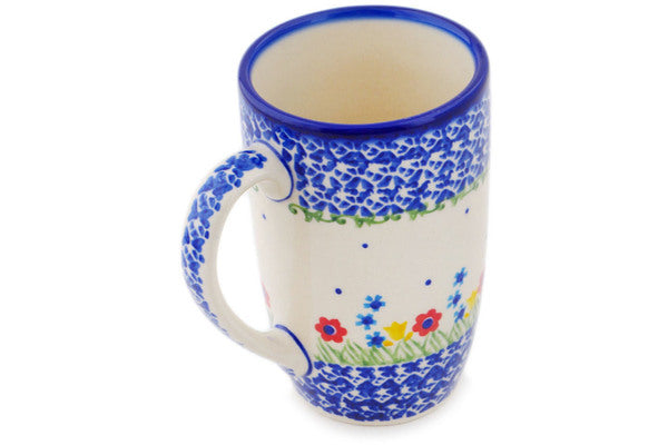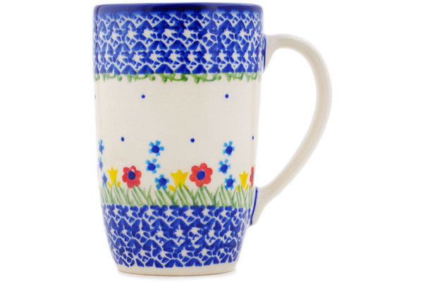 This Polish Pottery Mug is handmade and handpainted by the Ceramika Bona factory in Boleslawiec, Poland. Manufacturer item number H9776Q. It is 5¼" high and measures 4¾" by 3¼". The capacity of this Mug is 14.20 oz (brimful) and it weighs 1.0 lbs. It is part of the Primary Spring Collection.