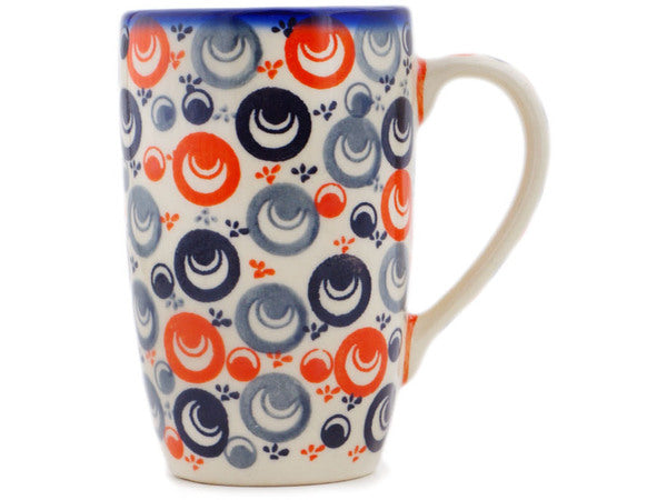 This Polish Pottery Mug is handmade and handpainted by the Ceramika Bona factory in Boleslawiec, Poland. Manufacturer item number H7181Q. It is 5¼" high and measures 4¾" by 3¼". The capacity of this Mug is 14.20 oz (brimful) and it weighs 1.0 lbs. It is part of the Red Peacock Eye Collection.