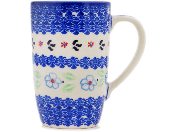 This Polish Pottery Mug is handmade and handpainted by the Ceramika Bona factory in Boleslawiec, Poland. Manufacturer item number H1958R. It is 5¼" high and measures 4¾" by 3¼". The capacity of this Mug is 14.20 oz (brimful) and it weighs 1.0 lbs. It is part of the Sweet Day Collection.