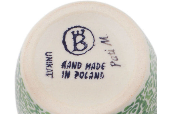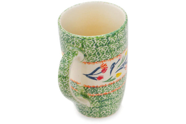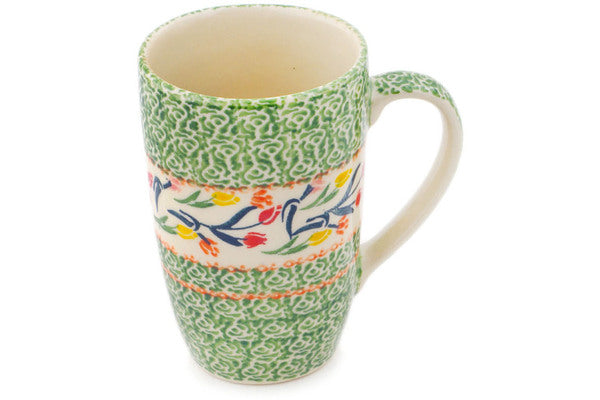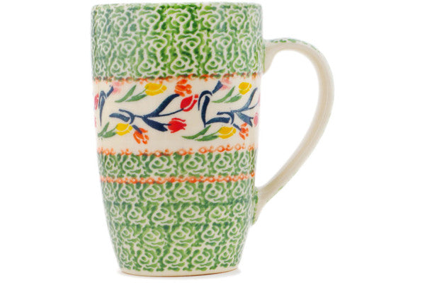 This Polish Pottery Mug is handmade and handpainted by the Ceramika Bona factory in Boleslawiec, Poland. Manufacturer item number H3688P. It is 5¼" high and measures 4¾" by 3¼". The capacity of this Mug is 14.20 oz (brimful) and it weighs 1.0 lbs. It is part of the Tulip Ring Collection.