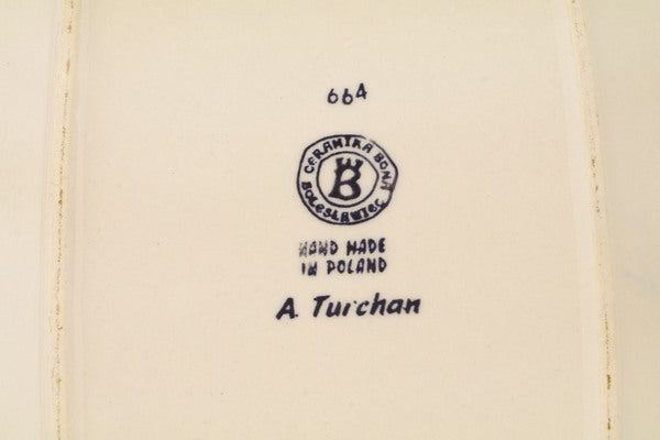 This Polish Pottery Platter is handmade and handpainted by the Ceramika Bona factory in Boleslawiec, Poland. Manufacturer item number H1994R. It is 1¼" high and measures 13¾" by 9¾". The weight of this Platter is 2.9 lbs. It is part of the Sweet Day Collection.